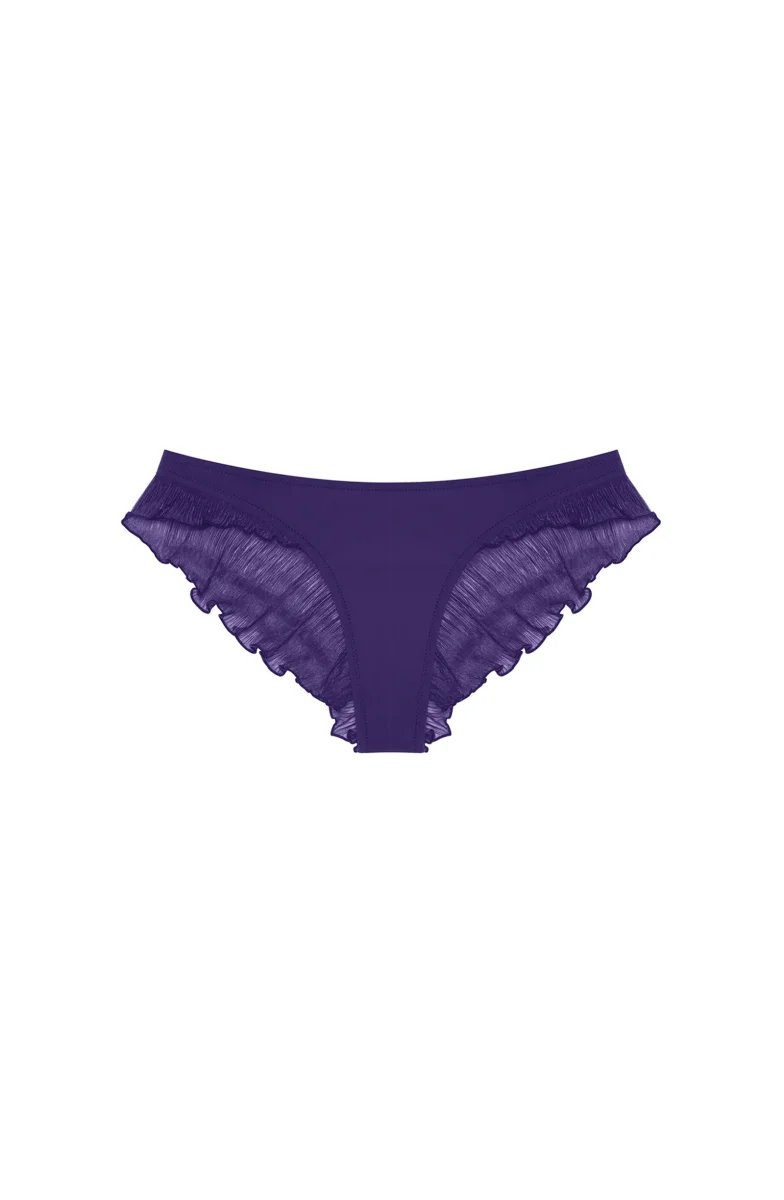 Iconic Pain de Sucre model, the bikini thong ALALA will seduce many women. The pleated voile ruffles at the back and on the sides give volume to your silhouette. Between bikini bottoms and lingerie, play the seduction card while asserting your femininity. Purple, a subtle yet bold shade, in deep indigo hues.