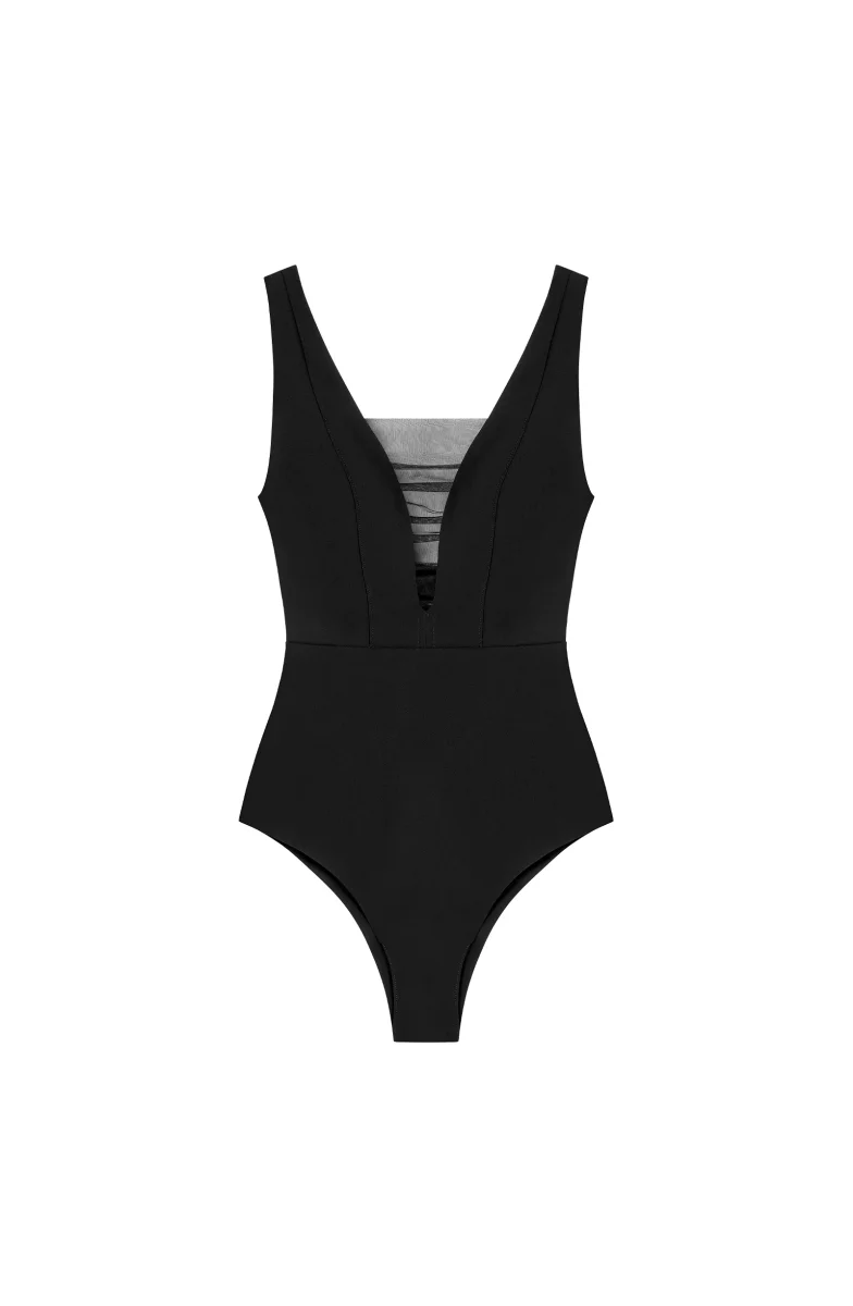 - Sheer flesh-tone voile ribbon tied in the back in white and sheer black voile for black