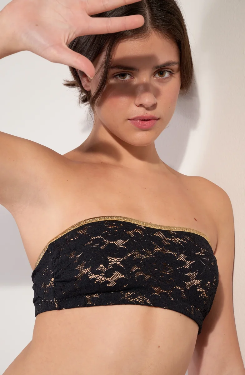 - Finished with a folded golden lurex elastic edge and a soft inner lining