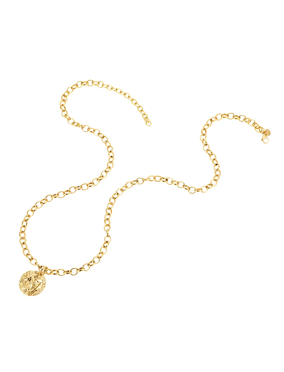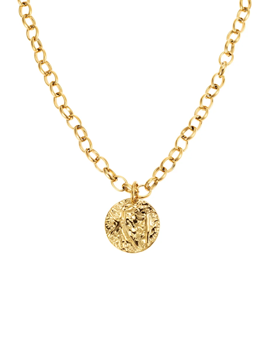 Den runda pendanten med sin detaljrika yta fångar ljuset vackert och ger en lyxig känsla till både vardags- och festoutfits. Den längre kedjan gör att halsbandet faller elegant över både höga och låga urringningar.