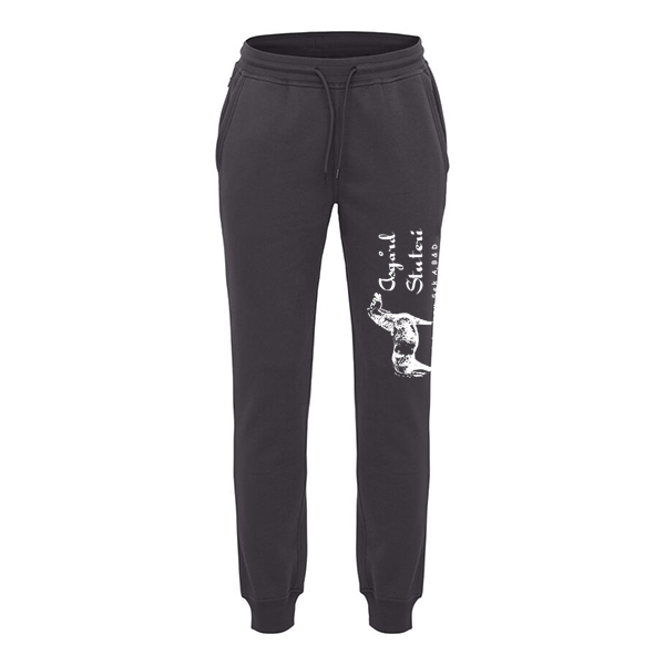 Unisex swettisbyxor gjorda av en blandning av bomull och återvunnen polyester. Har två framfickor och en dold ficka med dragkedja i sidosömmen. Den elastiska 2×2-ribben har dubbelsömmar vid midjan och benavslut. Asgård Stuteri logo tryckt på vänster lår.