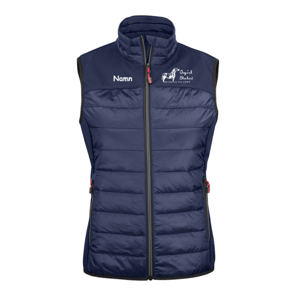 Softshell/ lättviktsväst. Oket, fram & bak, samtsidopaneler av softshell (tyg 1). Bål, fram & bak av vadderat lättviktsmaterial (tyg 2). Blixtlås och zip pullers i Printer Essentials-manér.