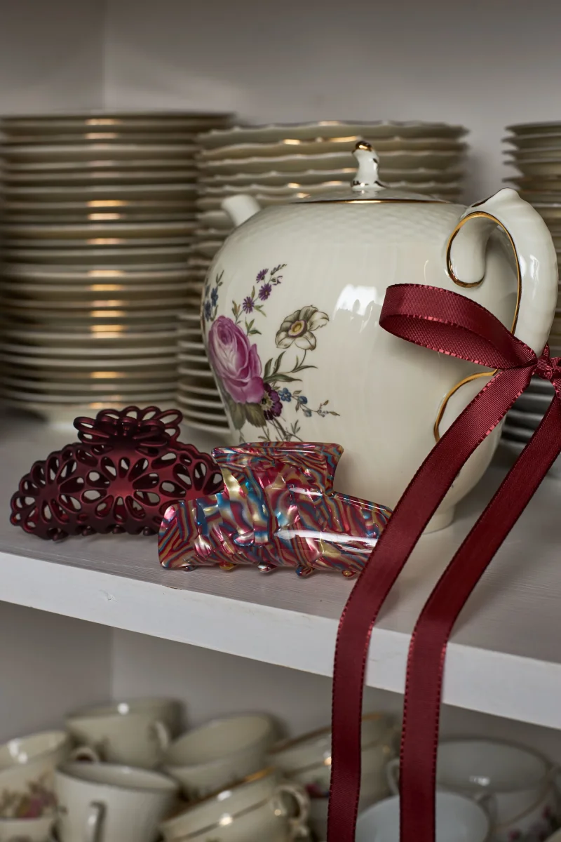 Praktisk hårklämma i borstat akryl som löser frisyren på sekunder. Den genomskurna designen med sina eleganta utskärningar ger både stadga och stil när du sätter upp håret.