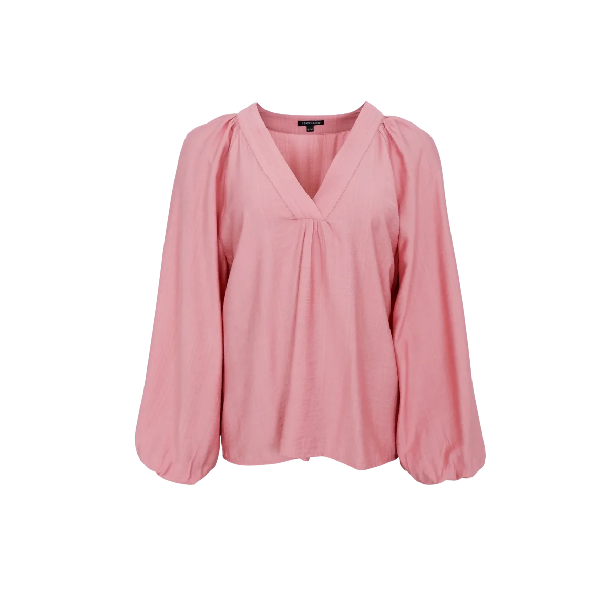 Mjuk rosa blus med ballongärmar som kombinerar komfort med feminin stil. Den smickrande V-ringningen med veck framtill skapar ett elegant fall som passar de flesta figurer.