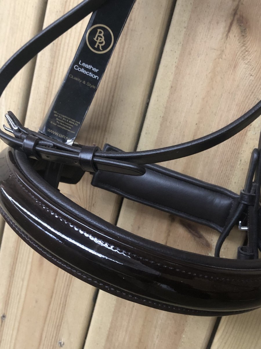 Symmetric bridle with an anatomically formed headpiece with soft padded lining. The throatlash is adjustable with one buckle at the bottom. The curved browband with patent leather has been incrusted with SWAROVSKI ELEMENTS and has a soft leather lining. The extra wide (circa 4.5 cm) crank noseband with patent leather is round raised, soft lined and has a wide chin pad with soft padded lining. The bridle features hook stud billets and round, shiny silver-coloured buckles.