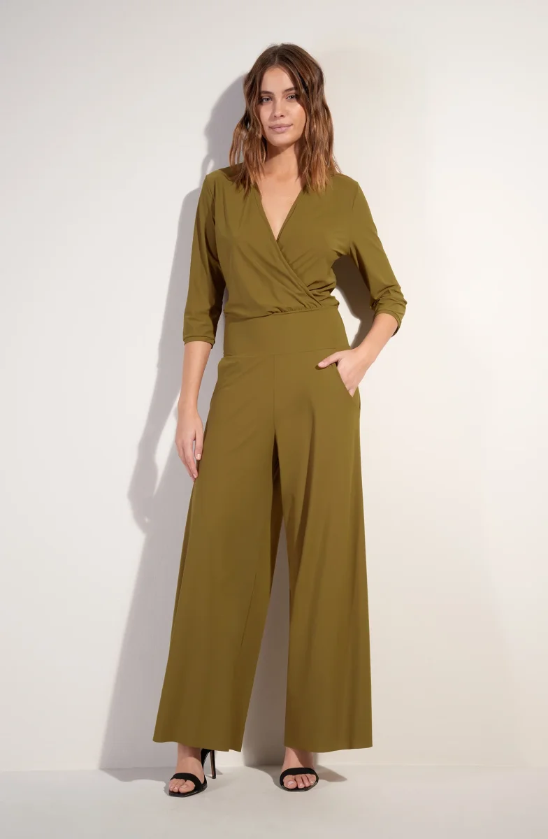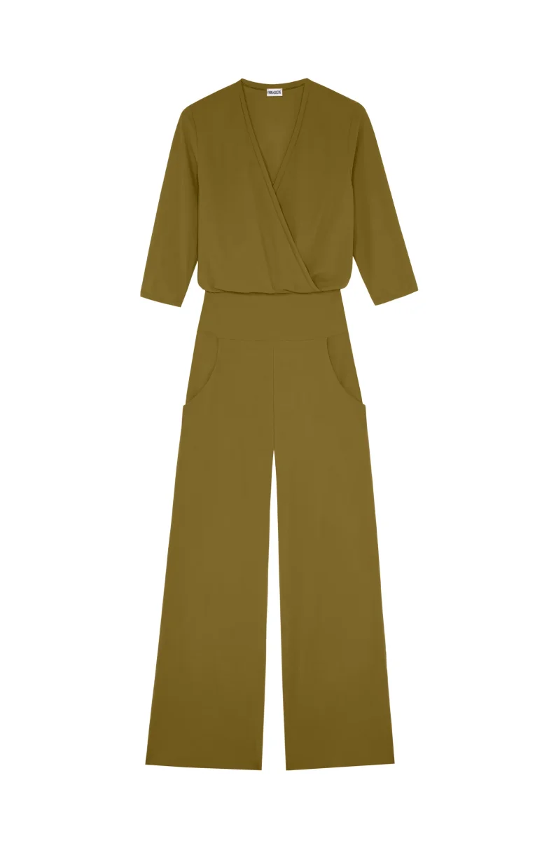 With its flowing trousers, the jumpsuit CARIN elegantly elongates the silhouette. The ¾-sleeved wrap top enhances the neckline. For the bottom, the patch pockets of the loose trousers underline the casual style of this outfit. Bronze, an authentic mineral shade, a blend of yellow and green.