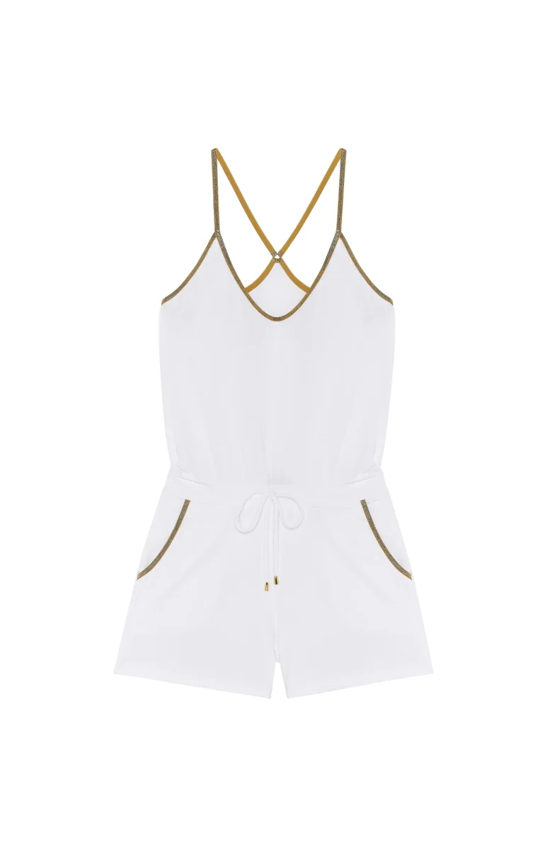 With its fitted shorts, its adjustable waist and its blouse top, the playsuit CHARLINE enhances the silhouette with lightness. The golden Lurex finishes bring a refined contrast to this sportswear outfit. A must-have piece of the summer wardrobe. A pure and delicate white that brightens the complexion.