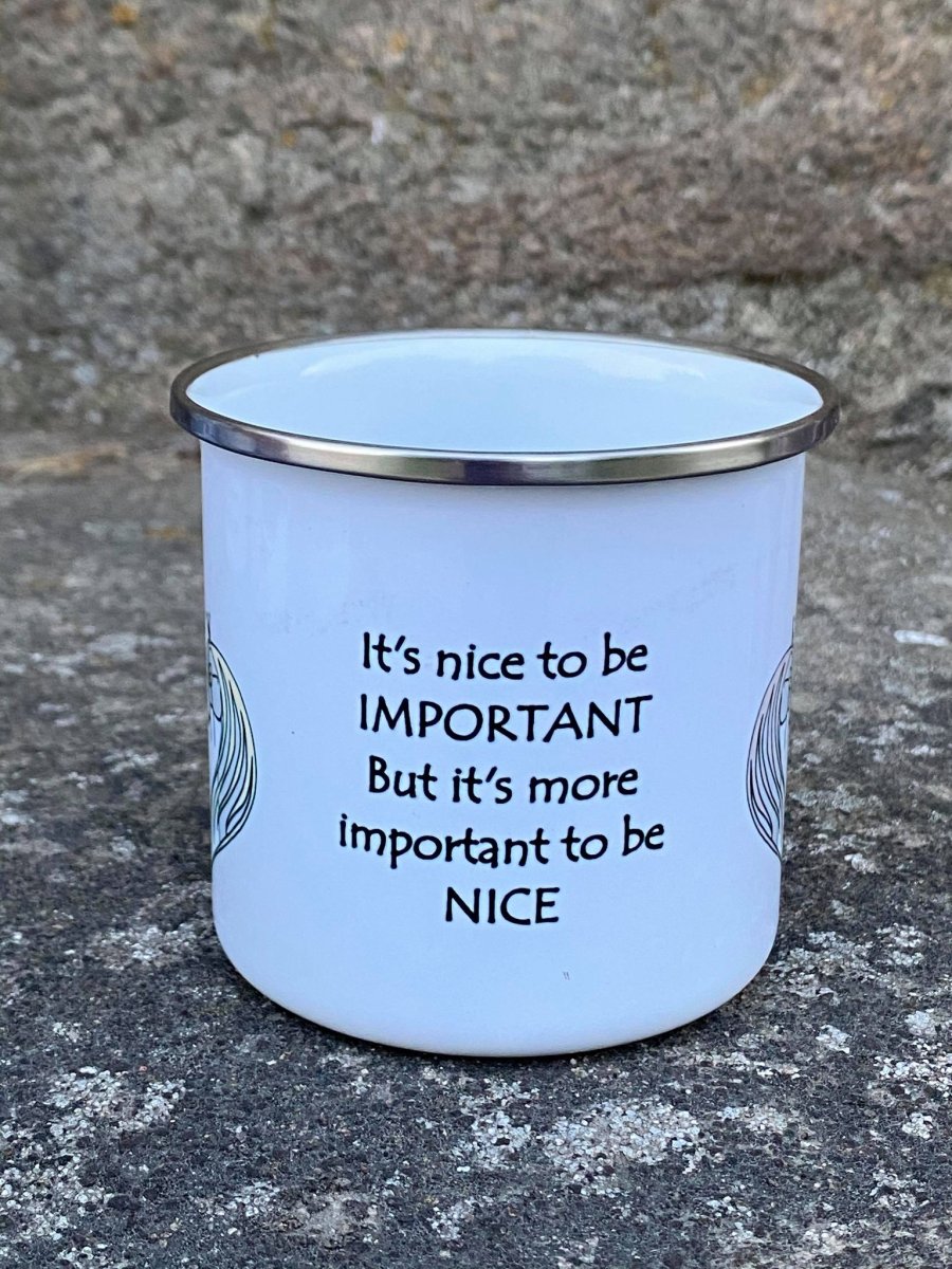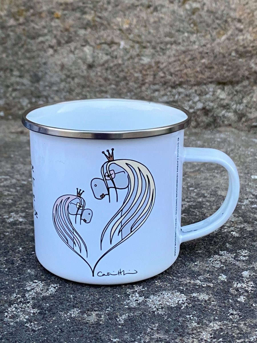 Emaljmugg vit med silverkant med ett ordspråk eller citat samt ett motiv som Catrin Henriksson har tecknat.