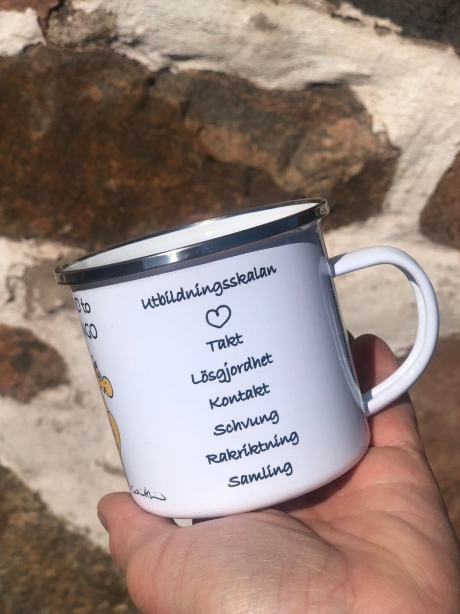Emaljmugg vit med silverkant med ett ordspråk eller citat samt ett motiv som Catrin Henriksson har tecknat.