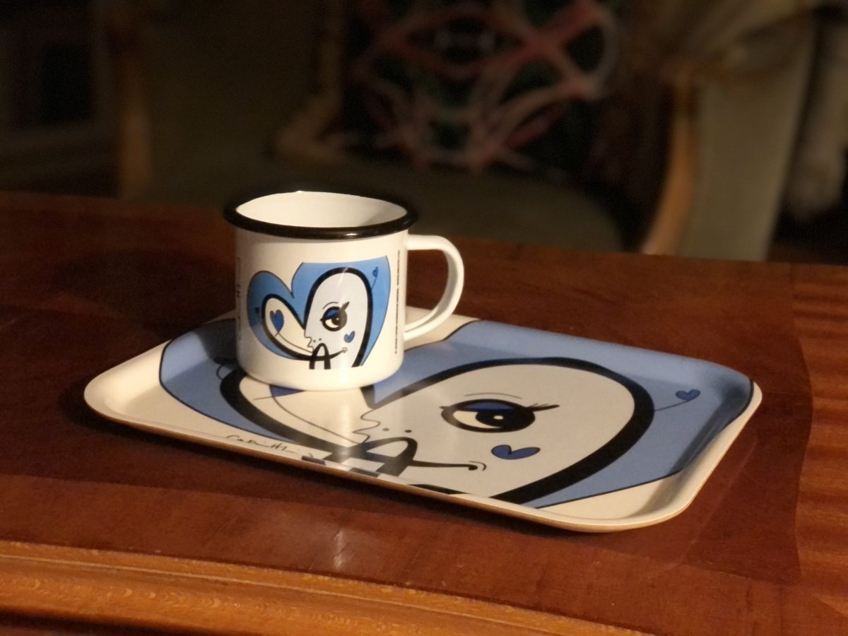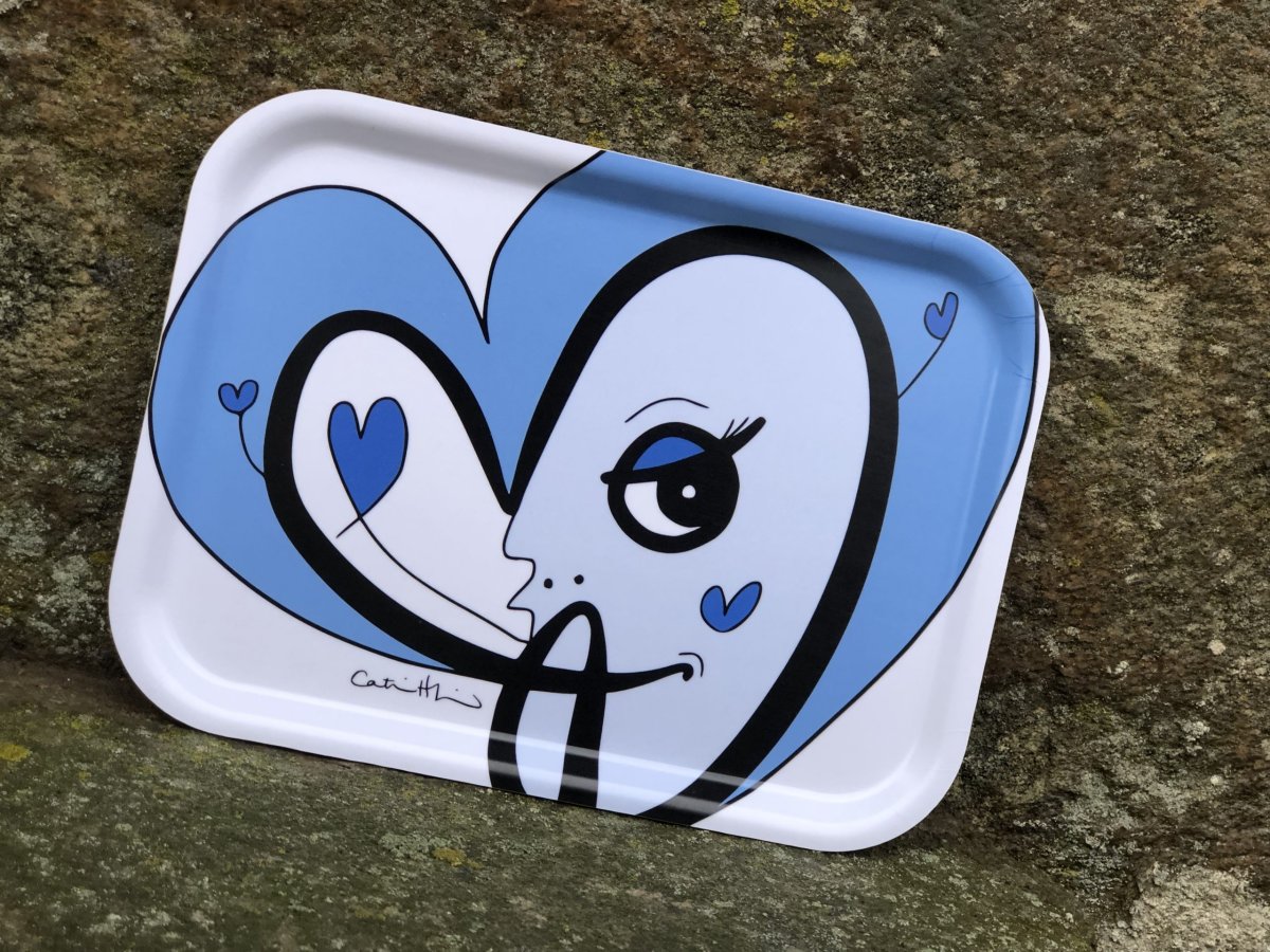 Svenskdesign när den är som bäst. Vit serveringsbricka med ett ordspråk/citat samt ett motiv som Catrin Henriksson har tecknat.