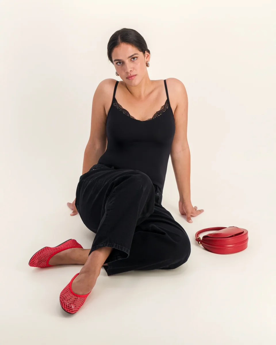 • Top près du corps• Effet gainant• Encolure en V avec dentelles• Fines bretelles réglables• Effet seconde peau• Brassière intégrée