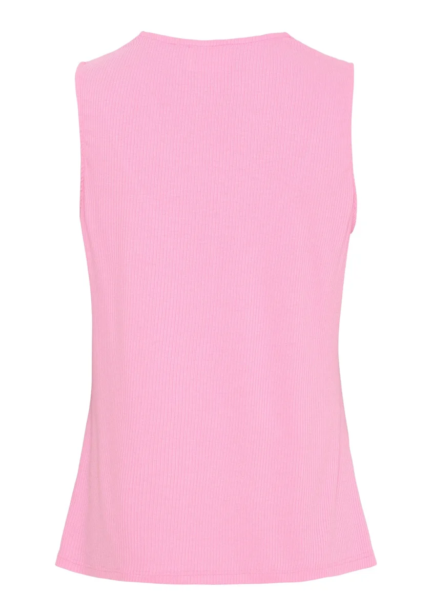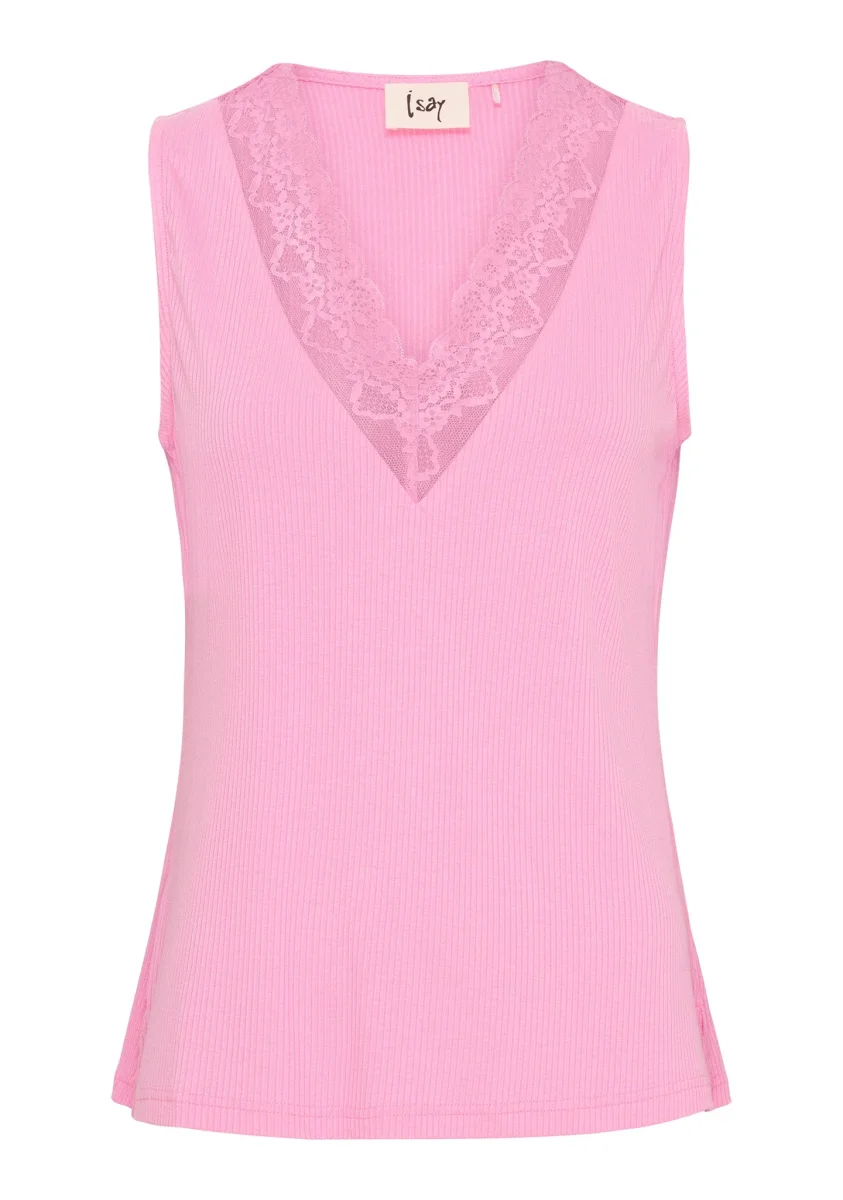 Rosa ribbstickad topp med feminin V-ringning och spetsdetaljer som skapar en vacker inramning. Den mjuka rosa färgen ger en romantisk touch till garderoben.