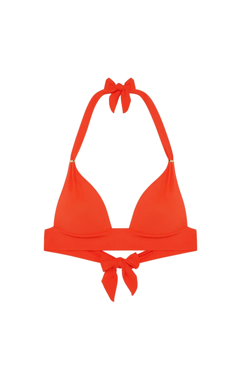 The triangle bikini top DIVA is a signature piece of the House PAIN DE SUCRE. Its push-up effect enhances the neckline… The wide ties tied around the neck and at the back ensure support and comfort. A band under the breasts gives this model a subtly refined sportswear touch and elegantly underlines the bustline. Orange, a modern and intensely zesty colour.