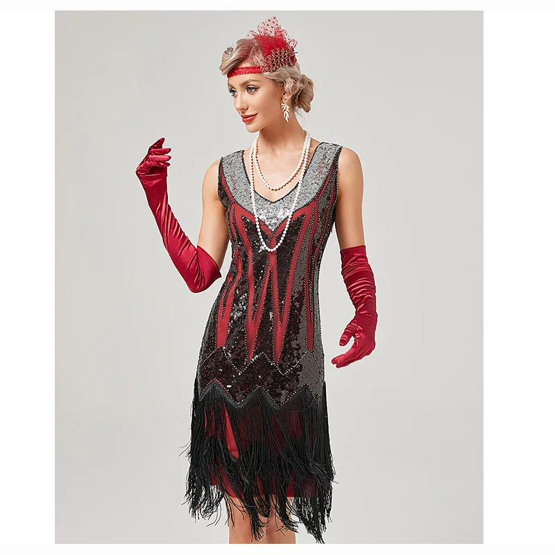 Den här underbara fransiga klänningen är inspirerad av 30-talet och finns i svart. Den är tillverkad av polyester och finns i ett brett utbud av storlekar, från XS till 3XL. Klänningen har ytterligare detaljer som grå och svarta fransar, paljettutsmyckningar och en fransad nederkant. Den