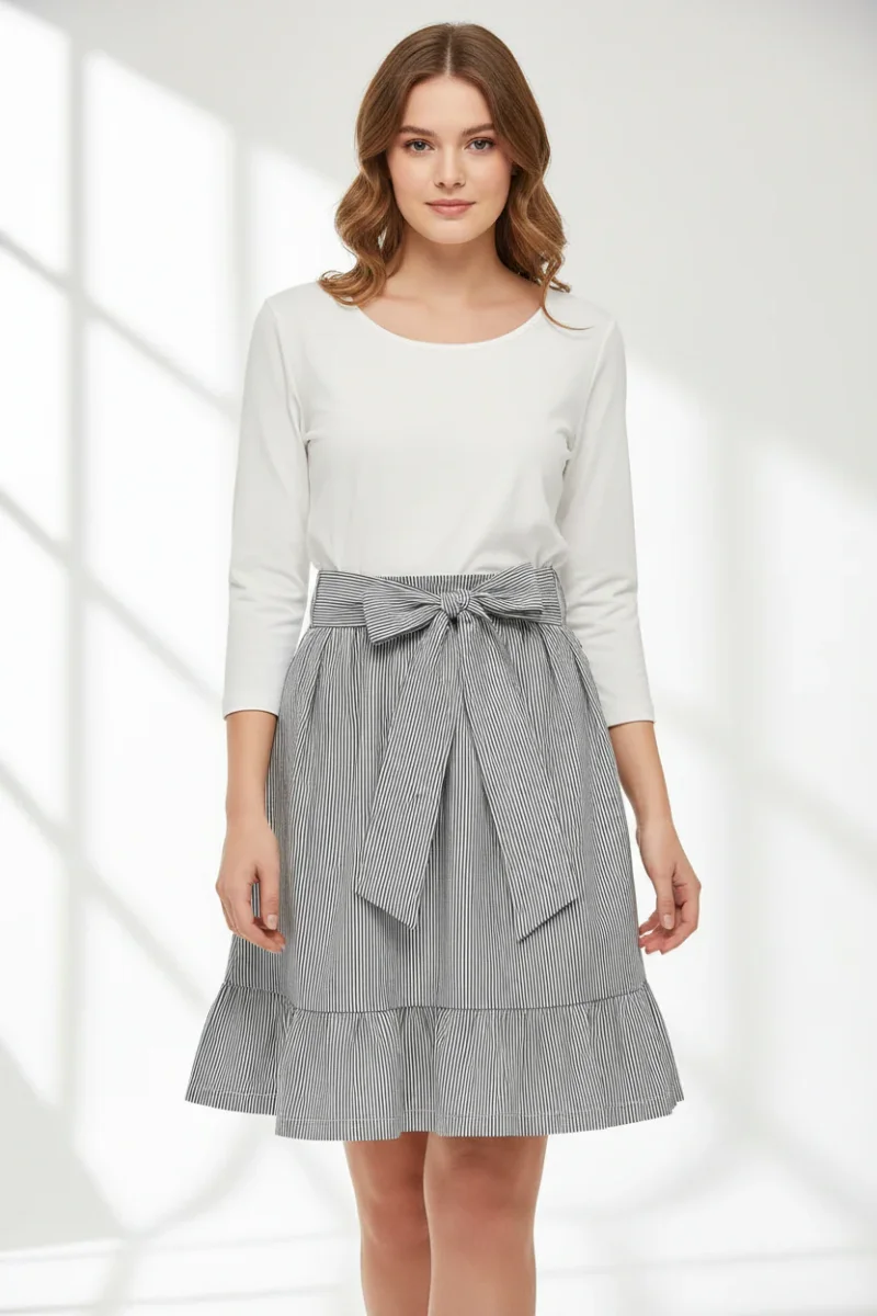 Kort klänning med knyt i midjan , mörkblå ränder i kjoldelen. Gabriella 3/4 mix dress kan uppfattas som två delar och är från JDY. Ränderna är i mörkblått