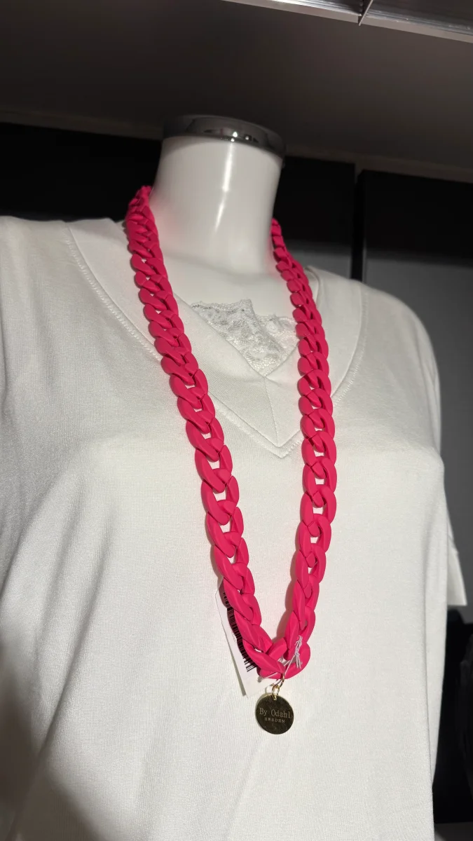 Kraftfull färgklick i cerise som lyfter varje outfit med modern attityd. De chunky kedjelänkarna i matt finish skapar en iögonfallande silhuett som balanserar trendkänsla med tidlös stil.