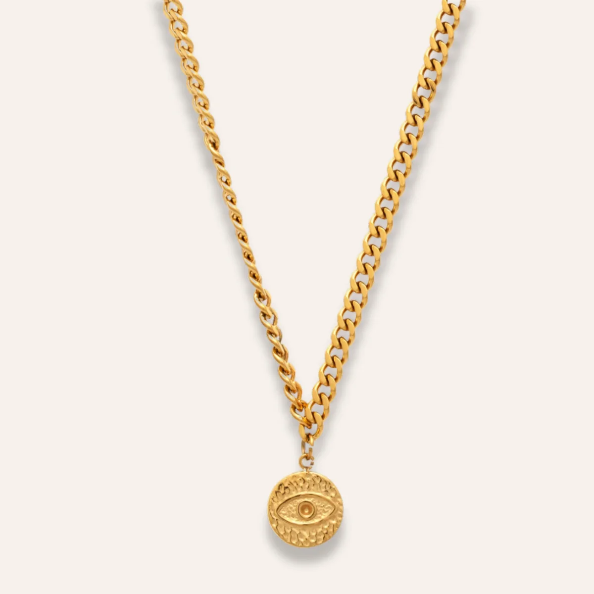 Detta är ett halsband med en något kraftigare kedja som utstrålar både modernitet och elegans. Kedjan kompletteras av en berlock formad som ett öga, en klassisk symbol för skydd, intuition och inre styrka.