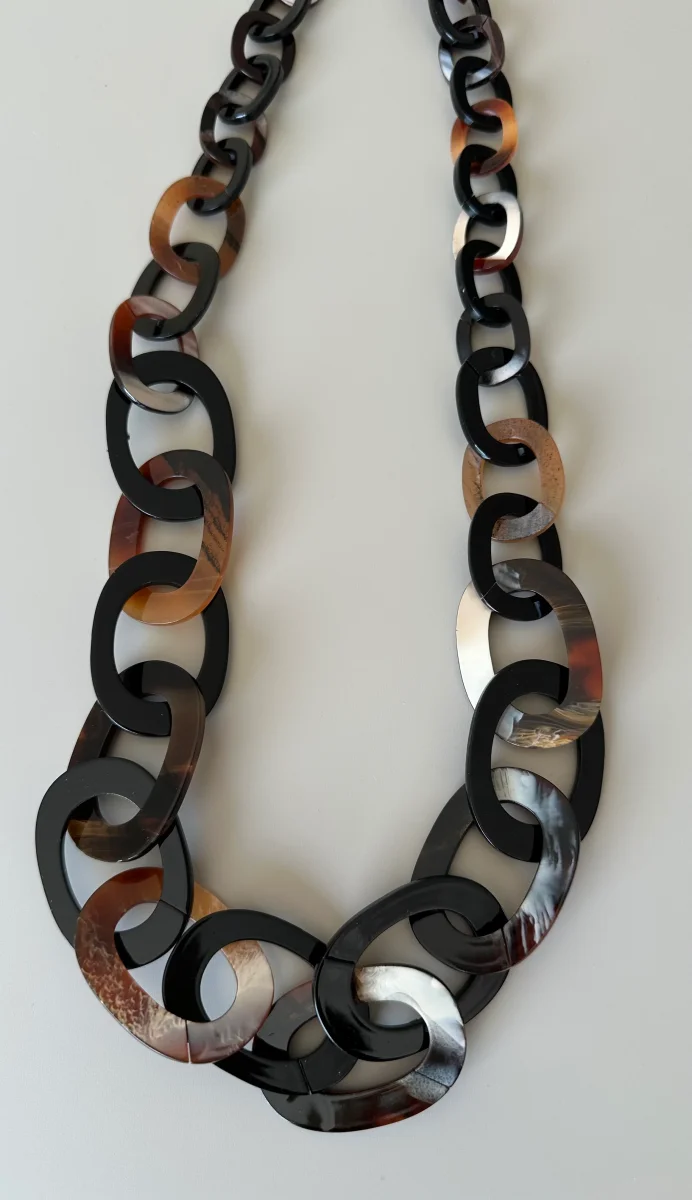 Organiska former i skönt samspel där varje länk flyter elegant in i nästa. Halsbandet kombinerar mjuka bruna toner med djupt svarta nyanser i en kedja som känns både modern och tidlös.