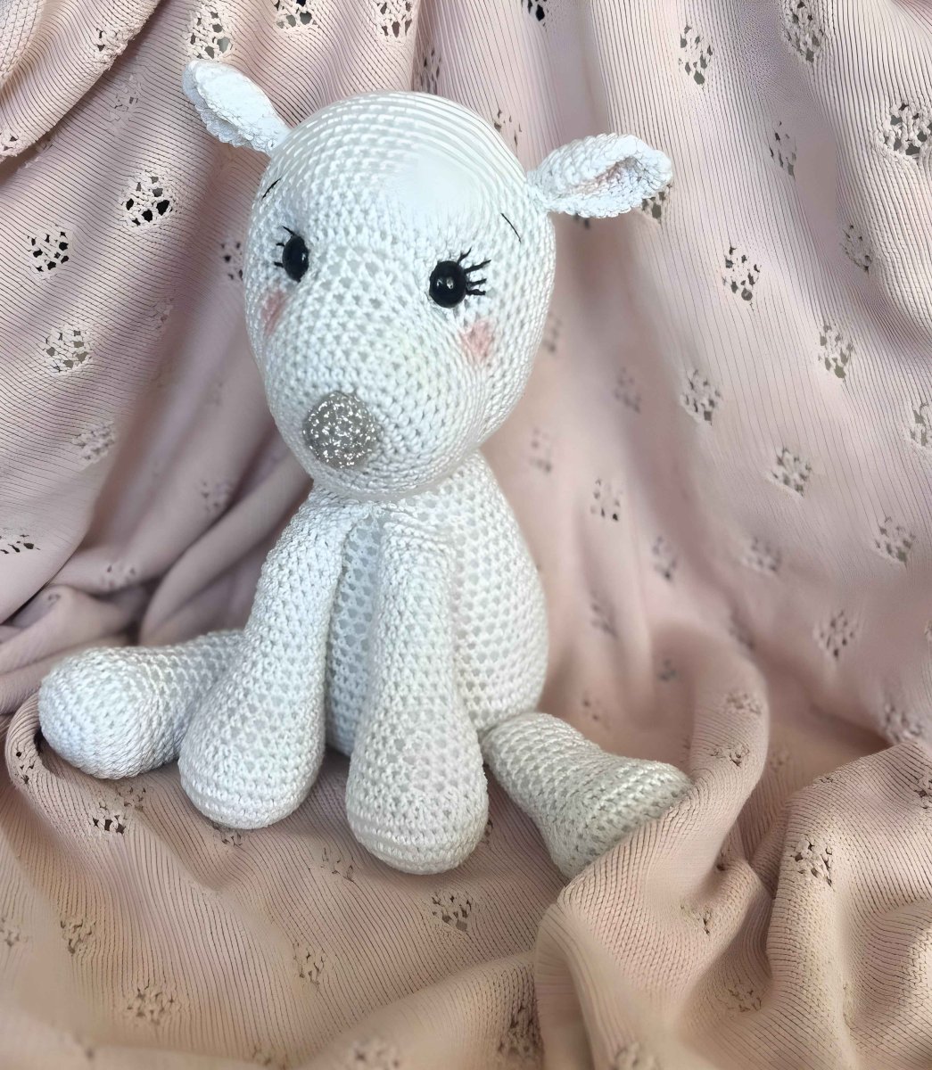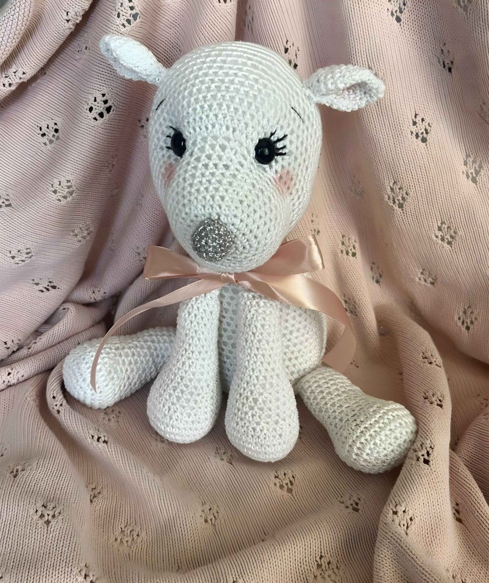 Denna handgjorda virkade babygosedjur är en bedårande och mjuk leksak, perfekt för små barn. Tillverkad av högkvalitativt, mjukt garn i en vit nyans, har den en len och mysig yta som är skonsam mot barns hud. Gosedjuret föreställer en söt liten ren med stora, uttrycksfulla ögon, rosa kinder och en glittrande nos, vilket ger den ett charmigt och vänligt utseende. Dess rundade öron och knubbiga ben gör den extra gullig och lätt att greppa för små händer. Gosedjuret är ca 20 cm hög och sitter stadigt på en mjuk, rosa bakgrund med ett delikat hålmönster. Helt handgjord med omsorg, är den både en trygg lekkamrat och en fin dekoration till barnrummet. Passar utmärkt som doppresent eller födelsedagsgåva.