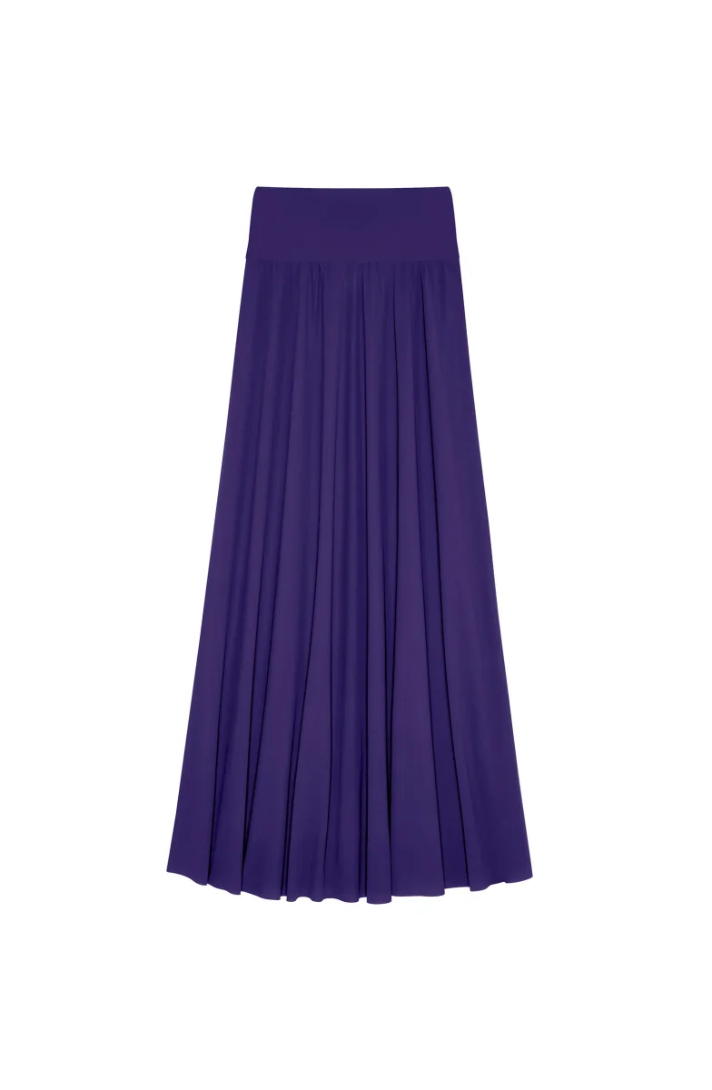 Flared skirt or strapless dress, JAYA can be worn according to your wishes and outings. Its flowing fabric is boosted with a wide elastic waistband to elegantly fit all body types. Purple, a subtle yet bold shade, in deep indigo hues.