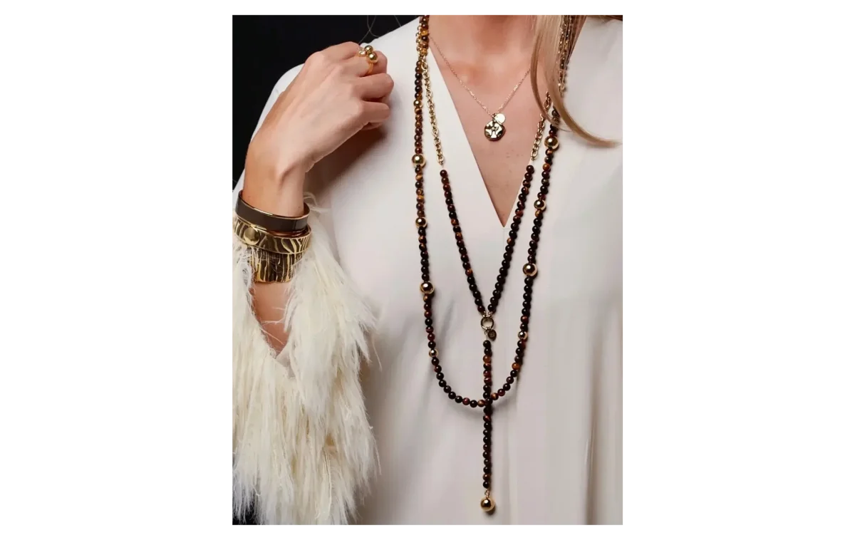 Kelly Icon Necklace Brown/Gold är ett långt halsband med vackra tigeröga-stenar i varma toner av brunt och guld. Detta signatursmycke från Bud To Rose ger mycket karaktär och blir en elegant detalj till din outfit.