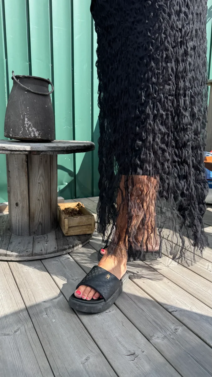 Stilren rak kjol med hög midja som ger ett rent och modernt intryck. Modellen har en slät framsida utan sömmar eller veck, tillverkad i vävt polyester med lätt struktur som ger kjolen stadga och en snygg siluett.