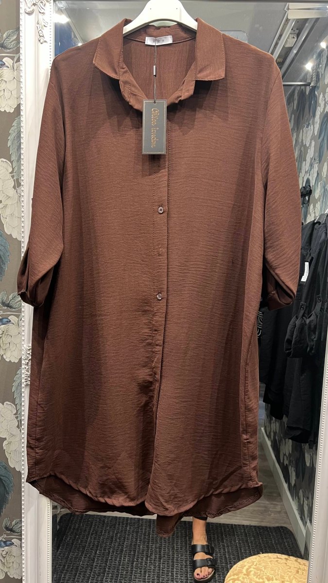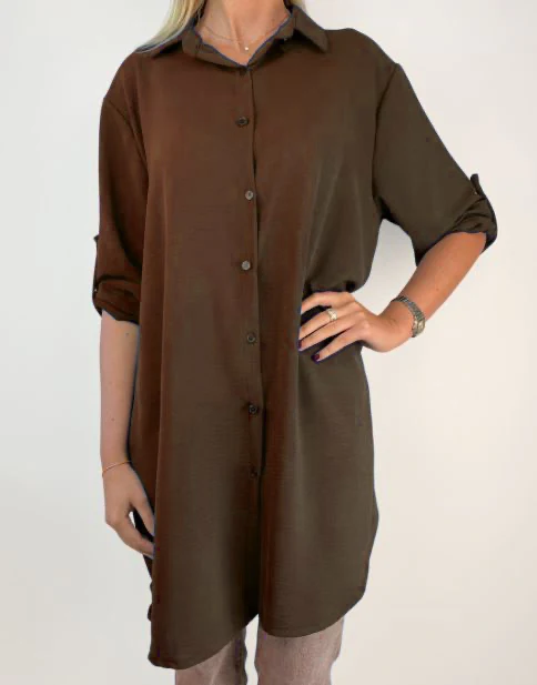 Mjuk skjortblus i varm chocofärg som omfamnar dig med sin generösa oversized passform. Den långa silhuetten med klassisk skjortkrage och knappslå framtill skapar en avslappnad elegans som fungerar lika bra till vardags som till fest.