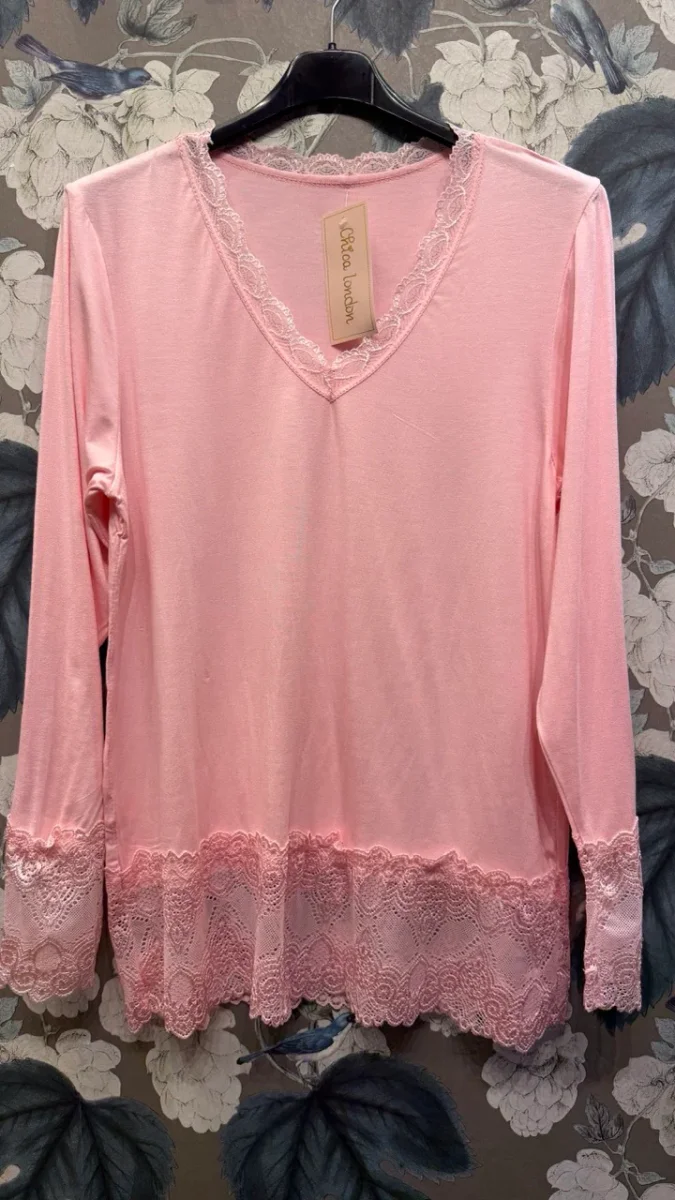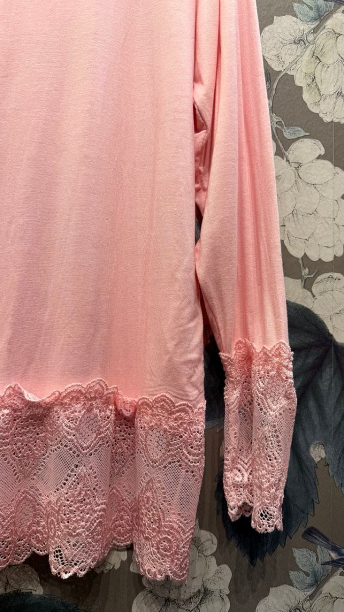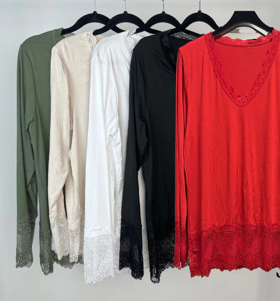 Elegant och feminin långärmad topp i mjuk viskos med elastan som ger en bekväm passform. Den ljuvliga designen har dekorativa spetsdetaljer vid V-ringningen, ärmslut och nederkant som skapar en romantisk och stilren look.