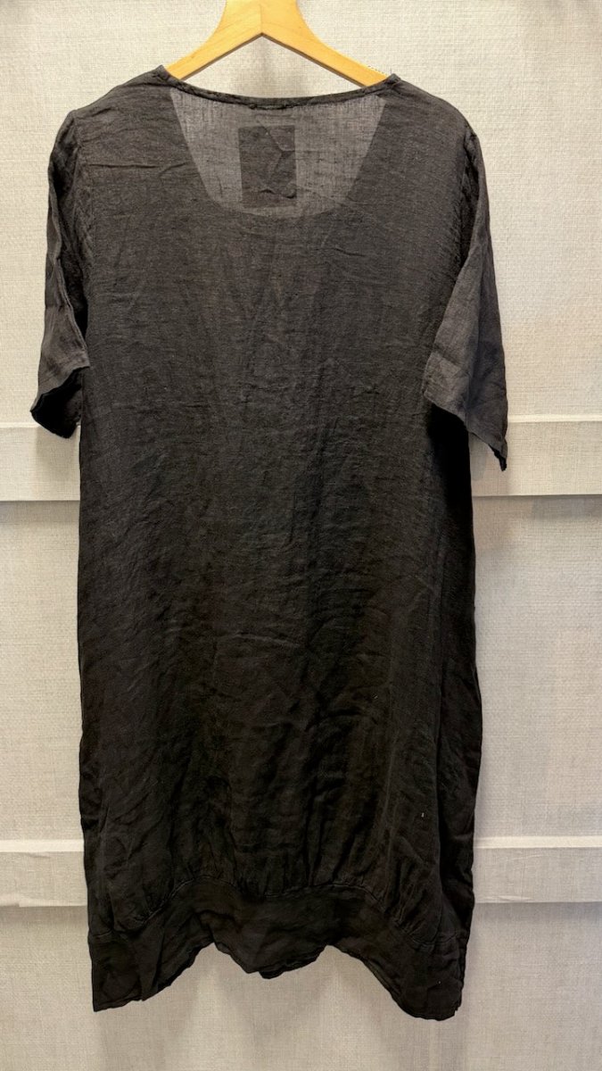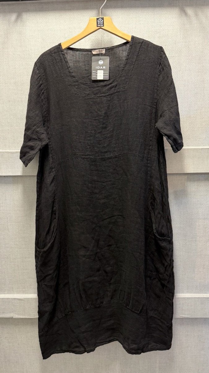 Oversized linneklänning med praktiska sidfickor och lätt U-ringad halsringning. Klänningen har en avslappnad passform som ger bekväm rörlighet.