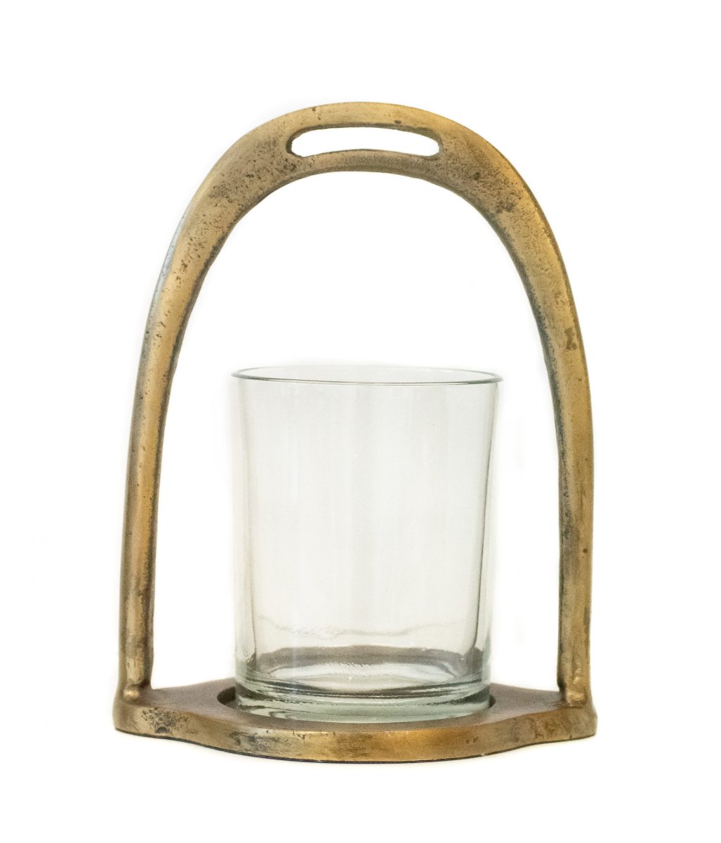 Stämningshöjande guldfärgad ljuslykta/vas med stigbygel i mässing och kupa.