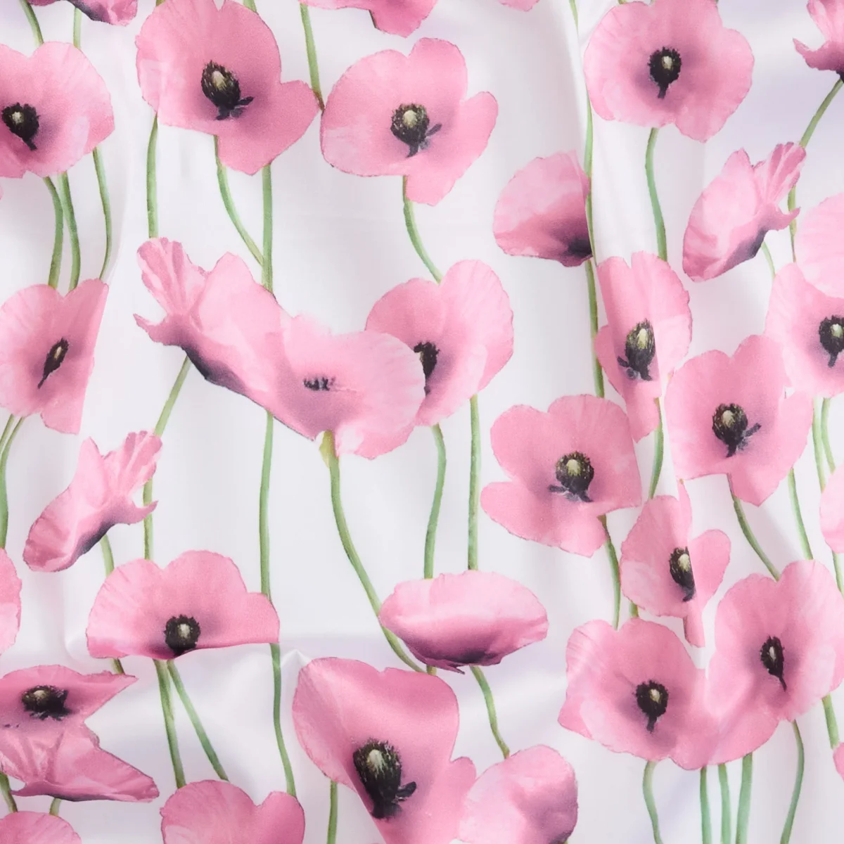 Vattenfärgade vallmoblommor i rosa nyanser dansar över denna luftiga halsduk. Med sitt romantiska blommönster och glansiga finish blir den en poetisk touch till både vardagsoutfits och särskilda tillfällen.