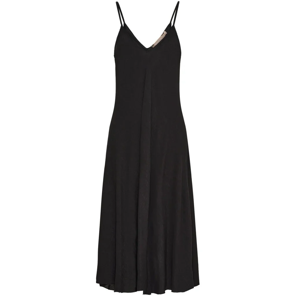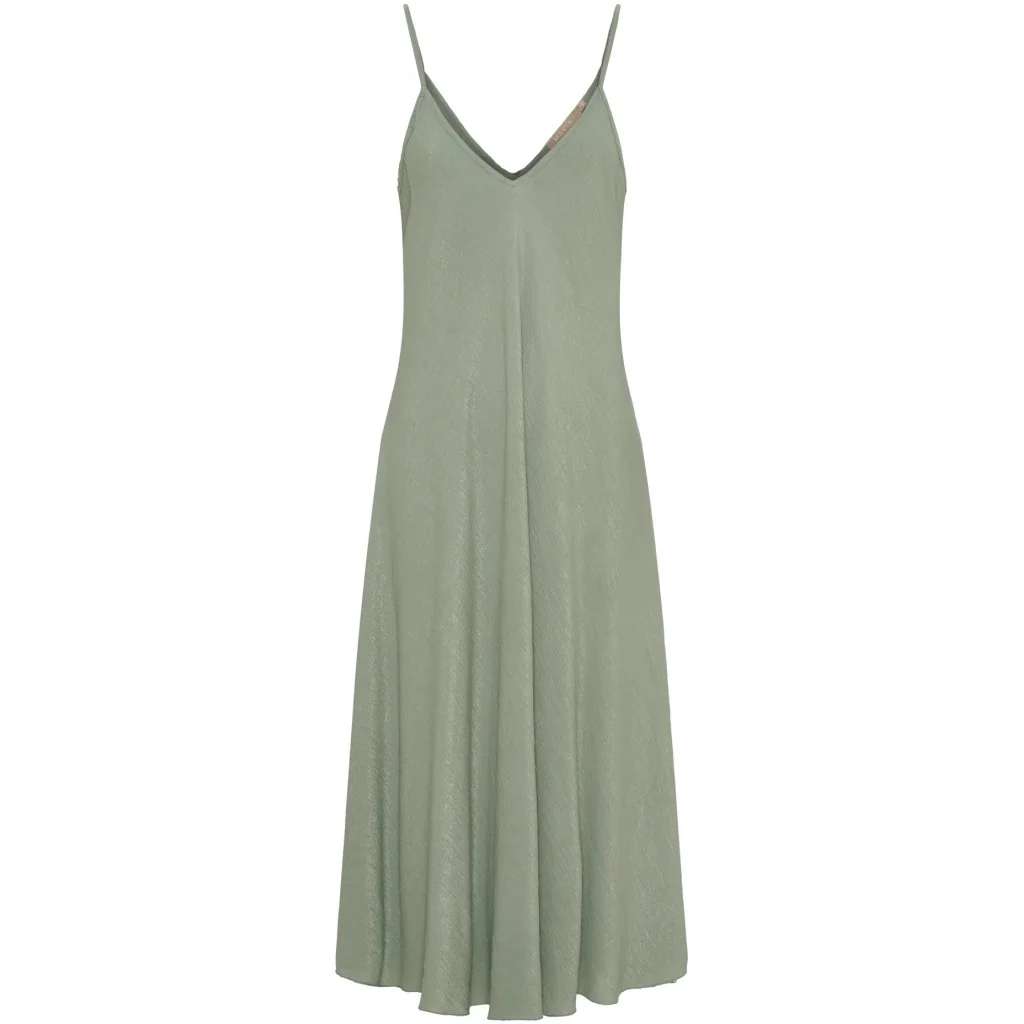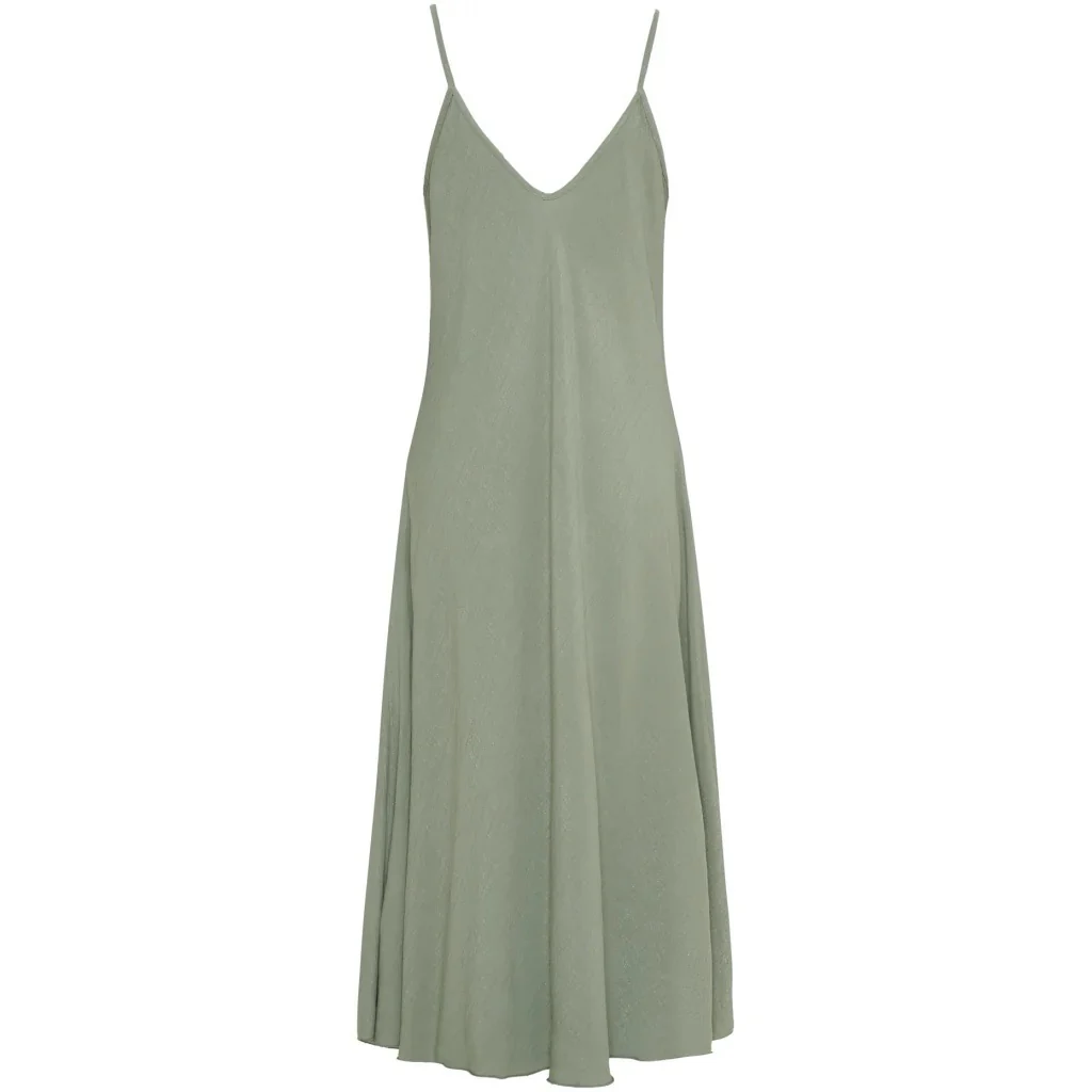 Mjuk midi-klänning med smala axelband och djup V-ringning som skapar en feminin silhuett. Klänningens avslappnade passform och flytande material gör den perfekt för både vardagsbrunch och kvällsaktiviteter.