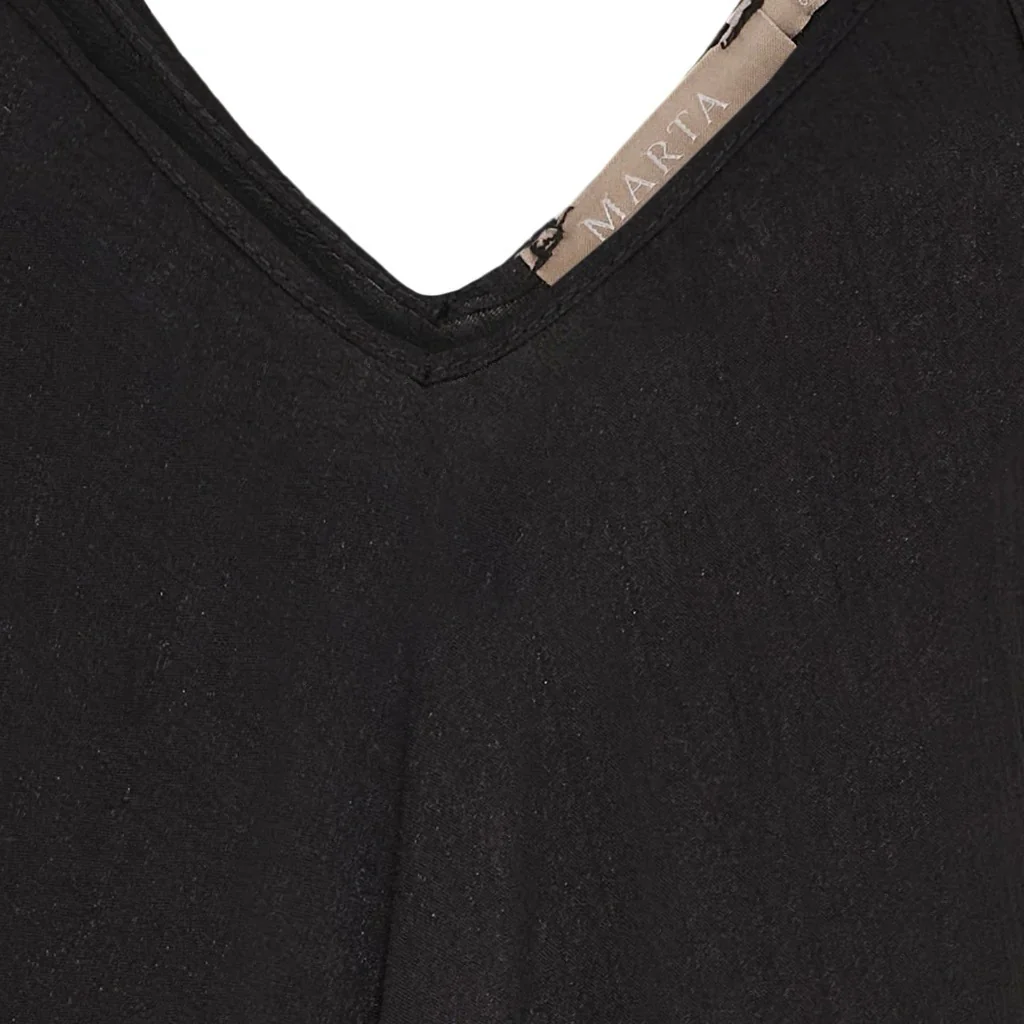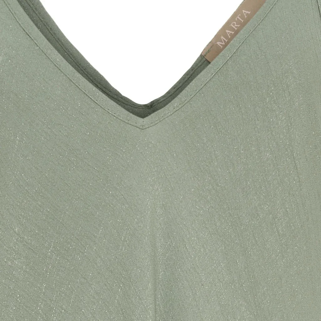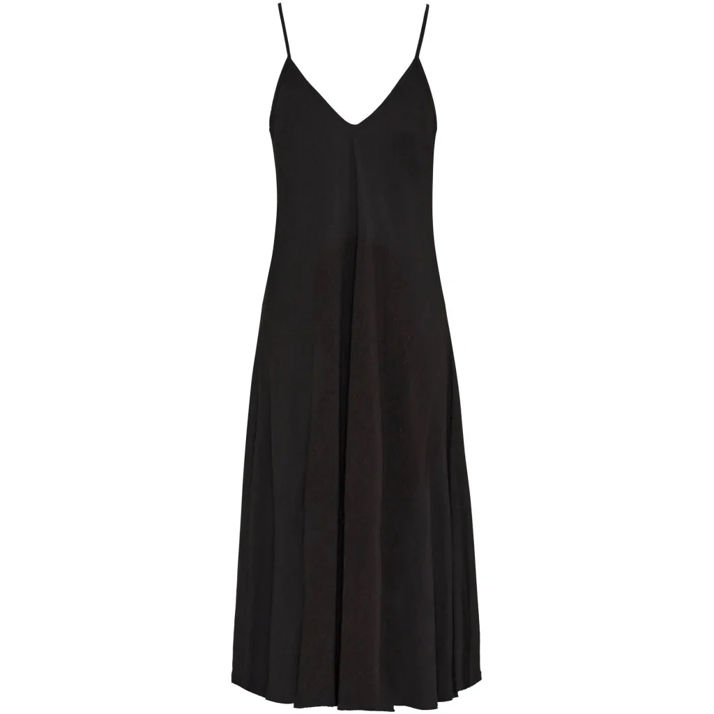 Mjuk midi-klänning med smala axelband och djup V-ringning som skapar en feminin silhuett. Klänningens avslappnade passform och flytande material gör den perfekt för både vardagsbrunch och kvällsaktiviteter.