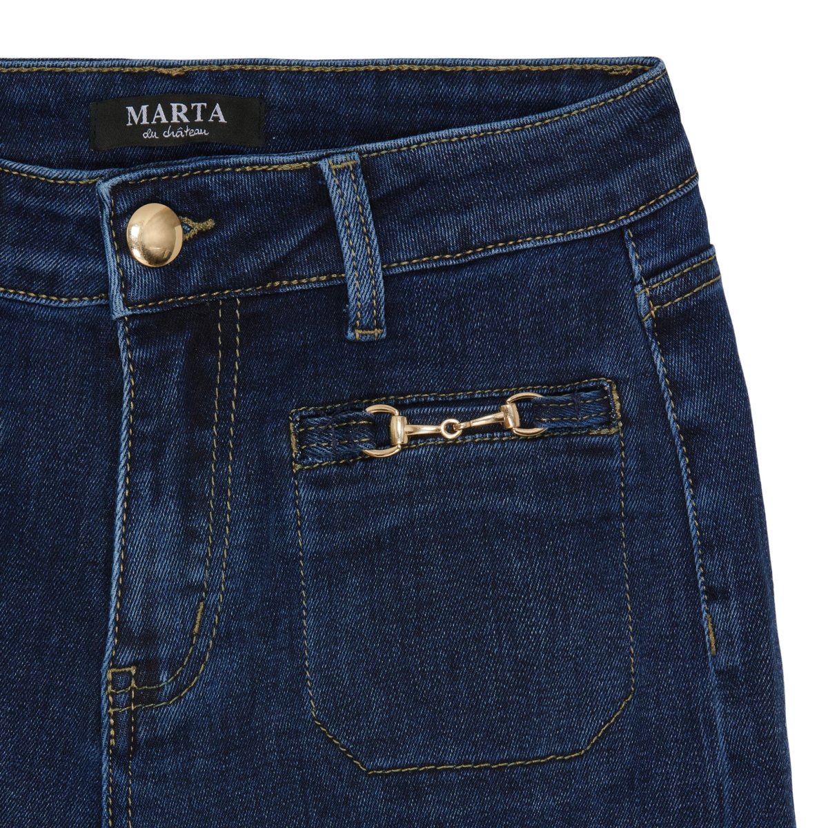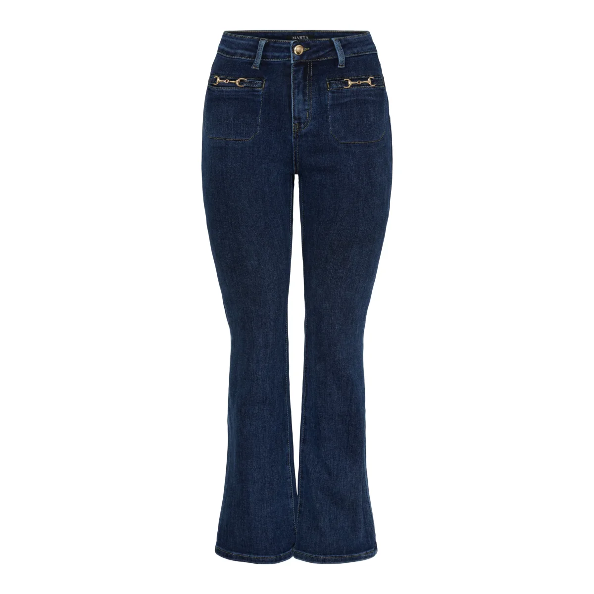 Bootcut-jeans i klassisk mörk tvätt som kombinerar retro-charm med modern passform. De guldtoniga hästbettdekorerna på bröstfickorna ger en elegant touch som lyfter den klassiska jeanslooken.