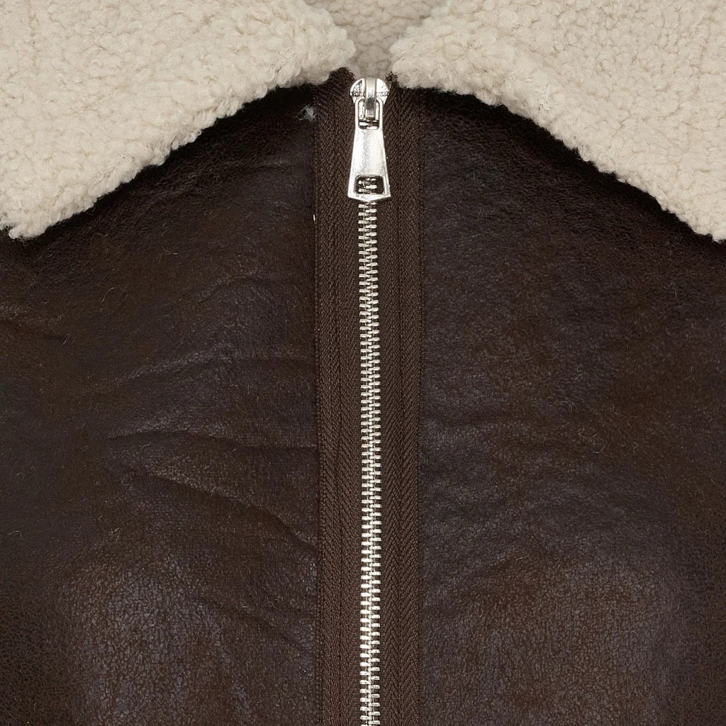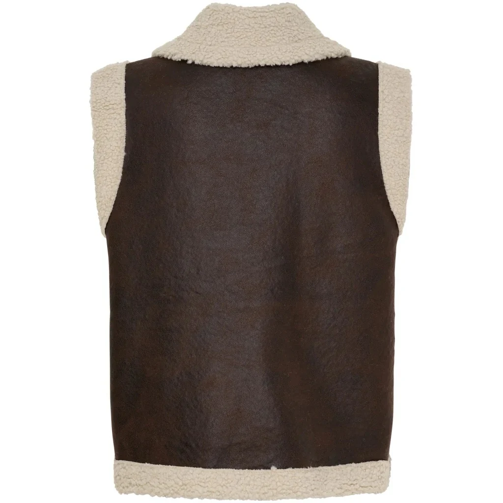 Den avslappnade passformen gör den idealisk att bära över allt från tunna blusar till stickade tröjor. Praktiska fickor framtill och den trendiga kontrasten mellan det mörkbruna yttertyget och det ljusa teddy-fodret skapar en modern lager-på-lager-look som fungerar från vardagsäventyr till helgmys.