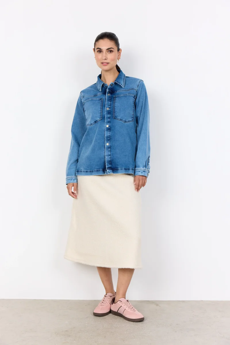 Klassisk denimskjorta i medium blue wash som lyfter vardagsoutfiten med sitt tidlösa uttryck. De väldefinierade bröstfickorna och vita knapparna skapar en balanserad helhet som känns både bekant och fräsch.