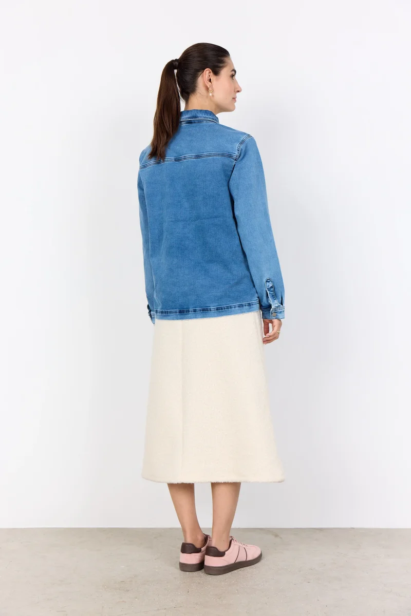 Perfekt passform med mjuk känsla tack vare bomullsblandningen med elastan som ger rörelsefrihet hela dagen. Kombinera med en midi-kjol för kontrasten mellan casual och feminin, eller välj matchande denim för en komplett jeanslook. Den klassiska kragen och knappslån framtill gör den lika lämplig för kontoret som för helgmys.