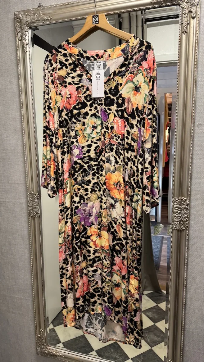 Leopardmönster och blommig romantik förenas i denna unika skjortklänning som vågar sticka ut från mängden. Med sin livfulla kombination av animaliskt tryck och färgglada blommor blir den en verklig statement-piece i garderoben.