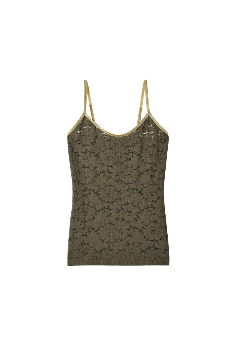 Avec sa coupe indémodable, le caraco SPENCER est une pièce maîtresse de la collection. Cette saison, le top en dentelle se pare avec éclat d’une somptueuse finition en lurex doré sur l’encolure. On aime la douceur de la dentelle raffinée qui épouse nos formes avec pureté et délicatesse. Lichen, une teinte organique, vert kaki.