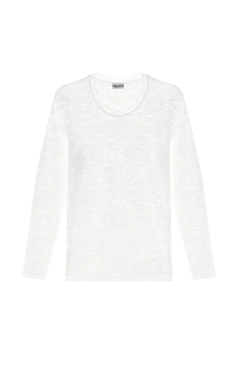 Comfortable and refined, the long-sleeved T-shirt TISSIA is a key-piece of the homewear wardrobe this winter. Its crew neck is adorned with an elegant and embroidered trim delicately underlining the floral pattern of the French lace. A soft top that promises you will be kept warm. A warm white colour inspired by sea foam.
