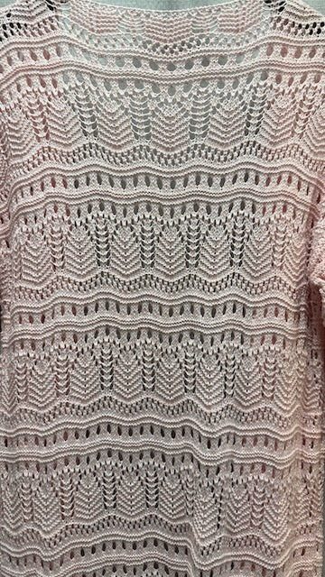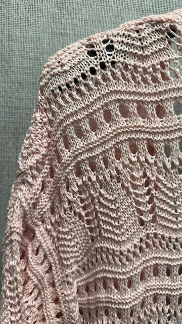 Virkad elegans i ljuvlig rosa nyans där luftigt material och genomarbetat mönster skapar en kaftan som snabbt blir en garderobsfavorit. Den långa, öppna modellen med trekvartsärmar förmedlar både avslappnad komfort och raffinerad stil.