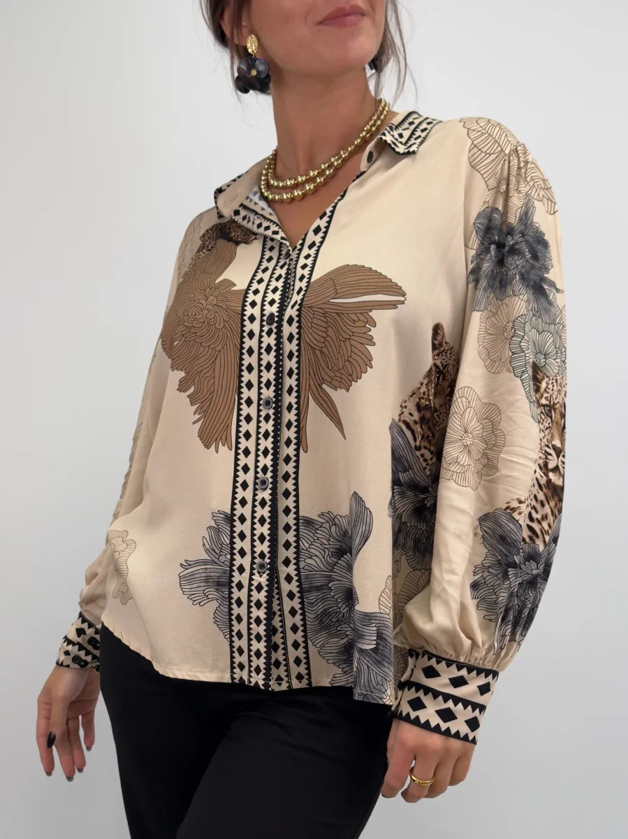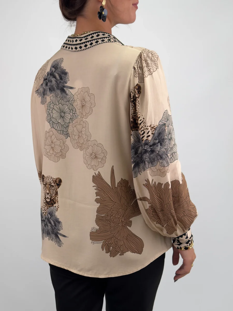 Elva är en stilfull viskosblus med ett iögonfallande mönster av leoparder och blommor som verkligen gör den unik. Den luftiga passformen och de vida ärmarna skapar en bohemisk känsla med en elegant touch, vilket gör blusen perfekt när du vill addera något extra till din outfit.