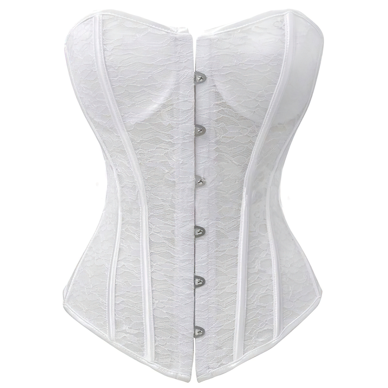 Lägg till en touch av fräschhet och lätthet till din outfit genom att bära den här korsetten i vit spets vars estetik förstärks med en lek av transparens. Den har en synlig dragkedja framtill som gör den lätt att ta på sig och snörning baktill gör att du kan anpassa den till din kroppsform.