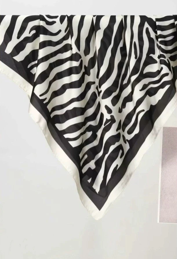 Fykantig sjal med grafiskt zebramönster i polyester med silkesliknande effekt. Glänsande yta och lätt, flytande material som ger en mjuk känsla mot huden.